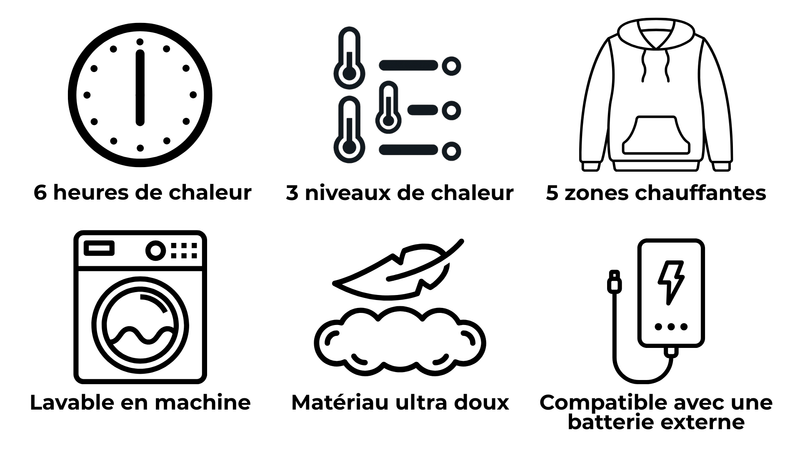 La batterie peut durer jusqu’à 6 heures avec une seule charge, selon le niveau de chaleur sélectionné. Cela vous assure une chaleur durable sans avoir besoin de recharger fréquemment. Si vous utilisez une batterie externe avec une plus grande capacité, votre HeatHoody restera chaud encore plus longtemps.